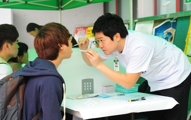 서울 동대문구 경희대학교 치의학전문대학원생들이 지난 9일부터 경희대학교 청원관 앞에서 구민들을 대상으로 무료 구강검진과 상담을 했다. 사진은 무료 검진에 참여한 경희대 학생과 주민의 모습.