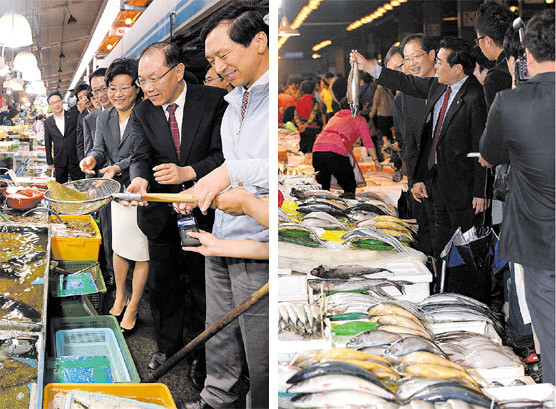 11일 오전 추석을 앞두고 황우여대표를 비롯한 새누리당 지도부와 전병헌 원내대표를 비롯한 민주당 지도부가 각각 서울 노량진 수산시장을 방문, 일본 후쿠시마 원전 방사능 오염수 유출 사태로 수산물 판매에 어려움을 겪고 있는 상인들과 이야기를 나누고 있다.