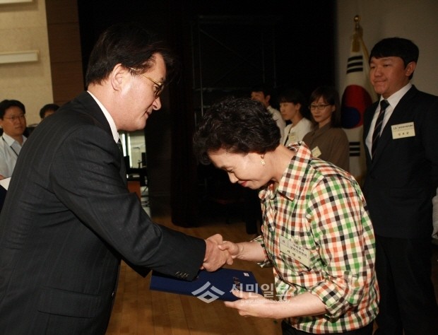 | ▲ 지난 11일 '제14회 사회복지의 날' 기념식에서 자원봉사자 서명자씨가 유종필 구청장에게 표창을 받는 모습. | ||