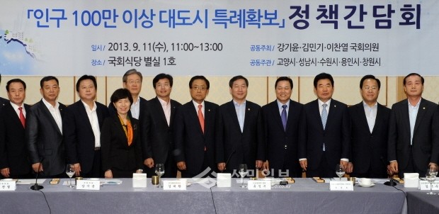 지난 11일 국회의사당 식당에서 안전행정위원회 소속 국회의원들이 주최하는 '인구 100만 이상 대도시 특례확보를 위한 정책간담회'가 열렸다. 사진은 정책간담회에 참석한 사람들의 모습.