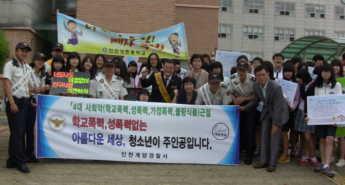 | ▲ 계양서가 마련한 학교폭력 없는 안전한 학교 만들기 캠페인 참가자들이 행사를 마친 후 기념촬영을 하고 있다. | ||