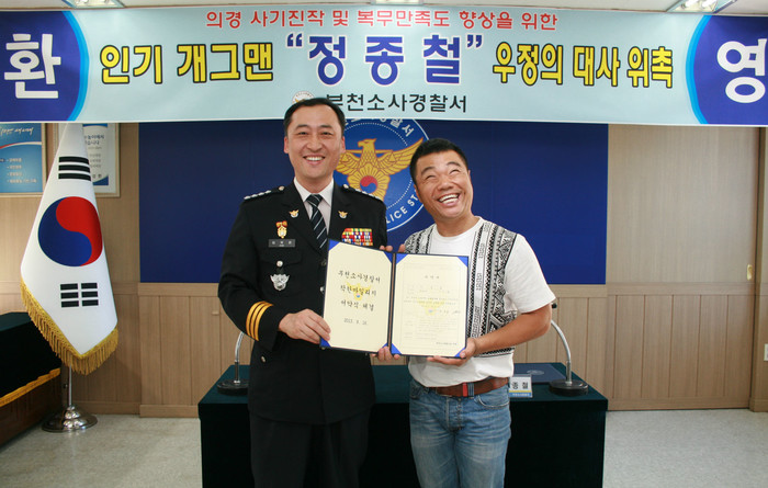| ▲ 김학관 서장(왼쪽)이 개그맨 정종철씨를 우정의 대사로 위촉한 후 함께 기념촬영을 하고 있다. | ||