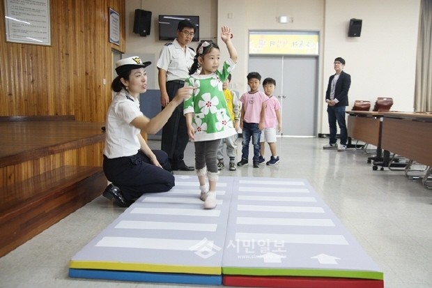 경기 구리경찰서는 16일 경찰서에서 구리시 어린이집 아이들 30여명을 대상으로 교통안전 교육 및 견학을 실시하였다. 사진은 교통관리계 김숙 경관의 ‘횡단보도 안전하게 건너는 법’ 교육에서 횡단보도를 건너는 실습을 하고 있는 아이의 모습.