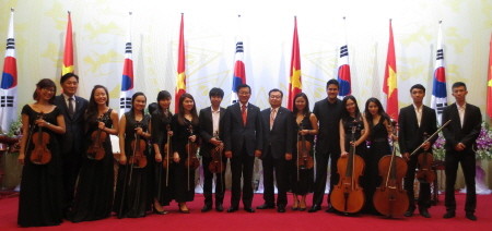 금호아시아나그룹(회장 박삼구)이 장학금을 후원한 베트남 국립음악원 재학생과 졸업생 등 총 11명의 베트남 학생들이 이날 국빈만찬장에서 모차르트 세레나데 3번과 4번, 그리고 카를로스 가르델의 뽀르우나까베자(Por Una Cabeza)를 연주했다.