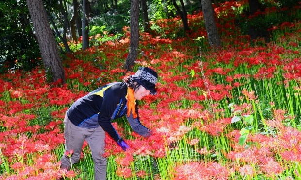 수선화과의 여러해살이풀인 꽃무릇은 주로 음지에서 서식하며 매년 9월 중순께 진홍색 꽃이 만발한다.