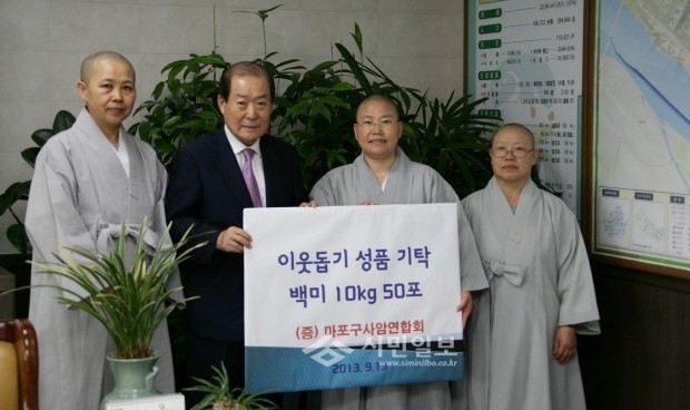 [시민일보]지난 13일 마포구 불교사암연합회는 지역내 어려운 이웃을 위해 쌀(백미 500kg)을 마포구에 기탁했다. 사진은 박홍섭 구청장과 견휴스님(불교사암연합회 회장)이 전달식 후 기념촬영하는 모습.