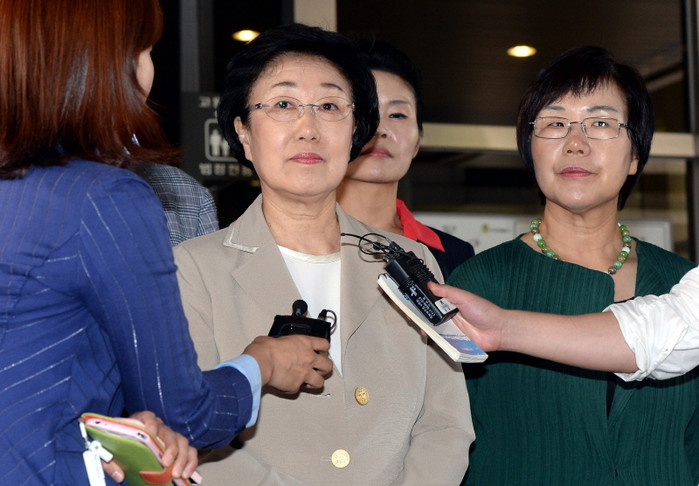 | ▲한만호 전 한신건영 대표로부터 불법 정치자금 9억여원을 받은 혐의로 불구속 기소된 한명숙(69) 전 국무총리에 대한 항소심이 열린 16일 오후 한 전 총리가 법정을 나서며 취재진 질문을 듣고 있다. | ||
