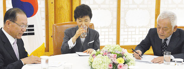 박근혜 대통령이 16일 서울 여의도 국회 사랑재에서 새누리당 황우여 대표, 민주당 김한길 대표와 3자회담을 갖고 있다. 박 대통령과 여야 대표는 이날 오후 3시30분께 국회 사랑재에서 만나 정국 현안에 대해 의견을 나눴으며 3자회담 시작 1시간20분여가 지난 오후 4시50분께 회담을 마쳤다. 박 대통령의 이번 국회방문은 역대 정부 최초로 대통령이 직접 회담 참석차 국회에 방문하는 것이다. 순방설명회 및 3자회담에 앞서 박 대통령은 이날 오후 2시44분께 국회 본관 2층 로비에 수행원들과 함께 도착, 정진석 국회사무총장의 영접을 받았다. 짙은 회색 외투와 바지정장 차림으로 나타난 박 대통령은 정 사무총장의 안내에 따라 국회 본관으로 입장, 3층 국회의장실에서 강창희 국회의장과 잠시 환담을 나눴다.