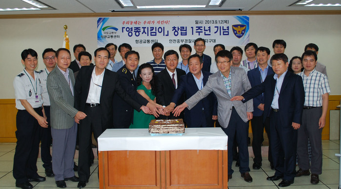 | ▲ 중부서 공항지구대 자율방범대를 창설 및 영종 지킴이 1주년 기념행사에 참여한 관계자들이 시루 떡을 자르며 포즈를 취하고 있다. | ||