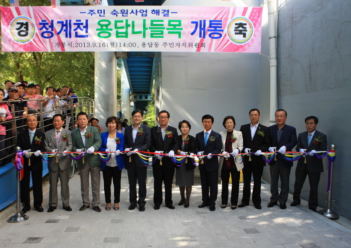 서울 성동구는 청계천 수변공원을 이용하는 시민의 접근성을 높이기 위해 추진해온 ‘용답역 보행통로(나들목)’공사를 완료하고 지난 16일 개통식을 가졌다. 사진은 개통식에서 리본커팅식을 하고있는 모습.