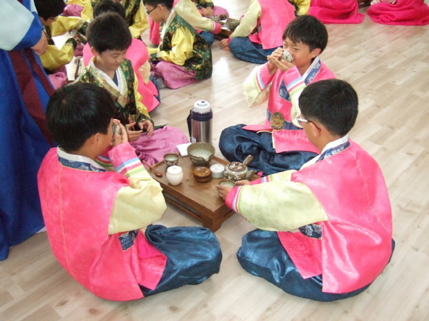 부천 원종초등학교는 24일 다문화 아동이 있는 학급 4개 반을 대상으로 한국다문화평화교육원 강사를 초빙해, 다문화 학생에 대한 이해와 마음 열기, 평화로운 다문화 사회 만들기 등의 주제로 다문화 평화 교육을 실시하였다. 사진은 다도 수업을 듣고 있는 아이들의 모습.