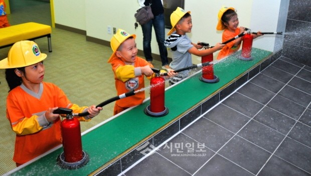 [시민일보]서울 은평소방서는 지난 24일 오전 10시 시민안전체험교실에서 평화 어린이집 원생 등을 대상으로 화재예방 소방안전교육을 실시하였다. 사진은 모형 소화기를 이용하여 신속하게 화재진압 체험을 하고 있는 아이들의 모습.