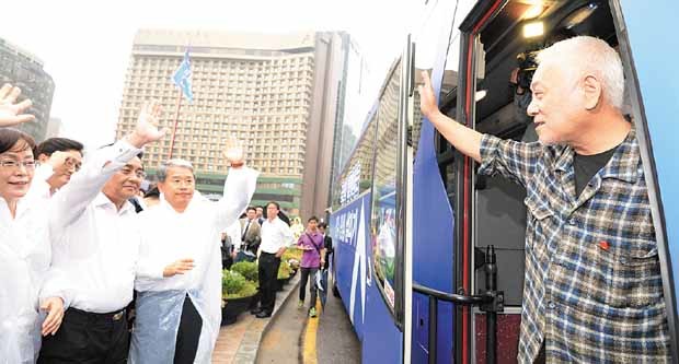 24일 오전 민주당 민주·민생 살리기 출정 결의대회가 열린 서울광장 천막당사 앞에서 김한길 대표가 민생살리기 현장간담회를 떠나며 차량에 올라 의원들에게 손을 흔들고 있다.