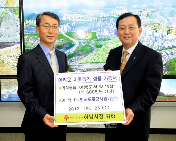 25일 한국도로공사경기본부는 하남시에 어려운 이웃에게 전달해 달라며 아동도서와 책상을 기탁했다. 시는 기탁받은 아동도서와 책상을 지역아동센터에 전달할 예정이다. 사진은 기증식 모습.