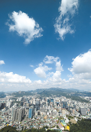 어제(24일) 가을비가 내린 뒤 25일 오후 남산에 있는 N서울타워에서 바라본 서울의 하늘이 청명하면서 높고 푸르다.
