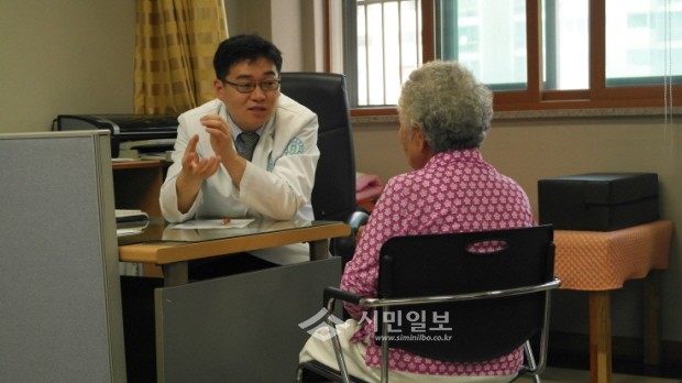 지난 25일 시립강동노인종합복지관이 연세무척나은병원과 연계해 매주 넷째주 수요일에 실시하고 있는 정형외과 무료 검진이 열렸다. 사진은 검진에 참여한 의료진이 주민에게 건강검진을 실시하고 있는 모습.