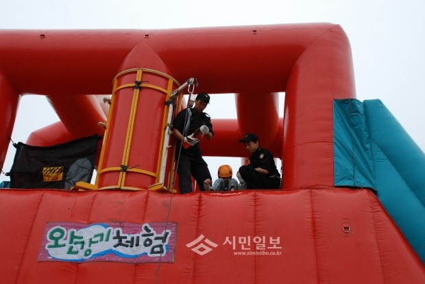 경기 양주소방서는 9월28일 양주 목화 페스티벌축제장에서 안전을 체험하면서 배우고 즐길 수 있도록 교육과 놀이문화를 결합해 구성한 '119소방안전체험캠프'를 실시했다. 사진은 모형탑에서 완강기 체험을 하고 있는 아이의 모습.