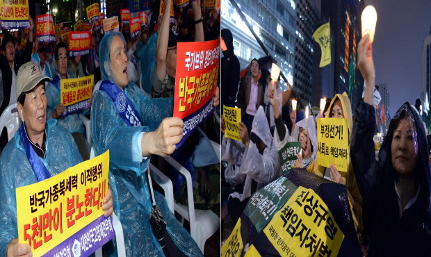 ▲ 28일 오후 서울 광화문 일대에서 서로 다른 입장의 '반국가 종북세력 대척결 9차국민대회'(왼쪽)와 '국정원 정치공작 대선개입 규탄 범국민대회'가 진행되고 있다.