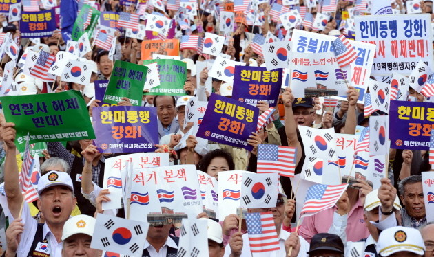 재향군인회, 호국보훈안보단체연합회, 국민행동본부 등 보수성향 단체 회원들이 30일 오후 서울역광장에서 '한미동맹 강화 종북세력 척결 국민대회'를 열고 있다.