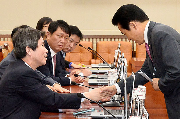 30일 오전 서울 여의도 국회 기획재정위원회 회의실에서 새누리당의 불참으로 전체회의가 무산된 가운데 새누리당 나성린 간사가 홀로 참석해 민주당 의원들에게 사과의 뜻을 전한 뒤 의원들과 인사를 나누고 있다.