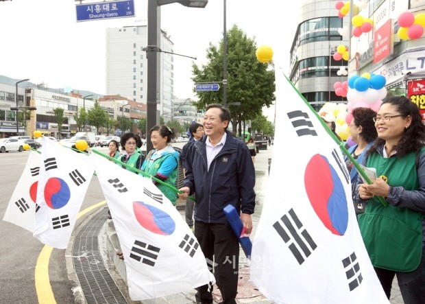 [시민일보]새마을운동 금천구지회는 지난 1일 시흥사거리에서 회원 80여명이 모여 나라사랑 태극기 달기 캠페인을 실시했다. 사진은 새마을운동 금천구지회 회원들과 함께 캠페인에 동참한 차성수 금천구청장의 모습.