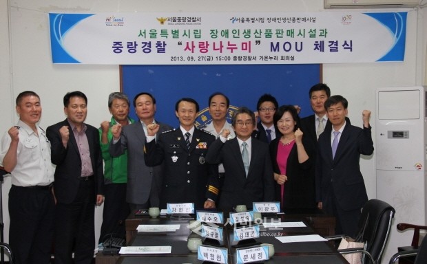 [시민일보]서울 중랑경찰서와 서울시립장애인생산품판매시설은 지난 27일 중증장애인생산품 우선구매 촉진사업에 상호 협력할 것을 약속하는 “사랑나누미” 업무협약식을 체결했다. 중랑경찰서와 시립장애인생산품 판매시설 관계자들이 협약식을 진행했다.