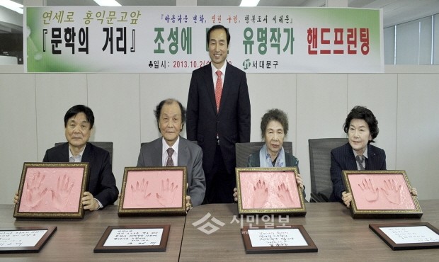 [시민일보]지난 2일 서울 서대문구청에서는 연세로 ‘문학의 거리’에 설치될 동판 제작을 위해 핸드프린팅을 실시했다. 사진은 이근배 시인, 조정래 작가, (한 사람 건너) 김남조 시인, 유안진 시인이 문석진 서대문구청장과 함께 핸드프린팅을 하고 있는 모습.
