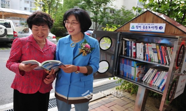 서울 송파구는 지난 1일 장지동 파인타운4단지 아파트에 ‘놀이터 공유도서관’을 개관했다. 도서관은 도서기증 행사를 통해 모은 500여권의 책으로 만들어졌고, 놀이터와 단지내 설치된 3개 공유도서관에 비치됐다. 사진은 개관식에서 박춘희 송파구청장(오른쪽)과 주민대표가 책을 꺼내 보고 있는 모습.