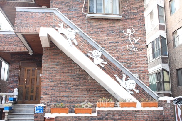 이외에도 길 중간 중간 ‘안녕하세요’ ‘사랑해요’ ‘웃으세요’와 같은 실생활 언어와 캐릭터가 조화를 이루고 있고, 건물 계단은 아이들이 미끄럼을 타는 모습을 표현한 재미(fun)를 담은 그래픽디자인 요소가 넘친다.