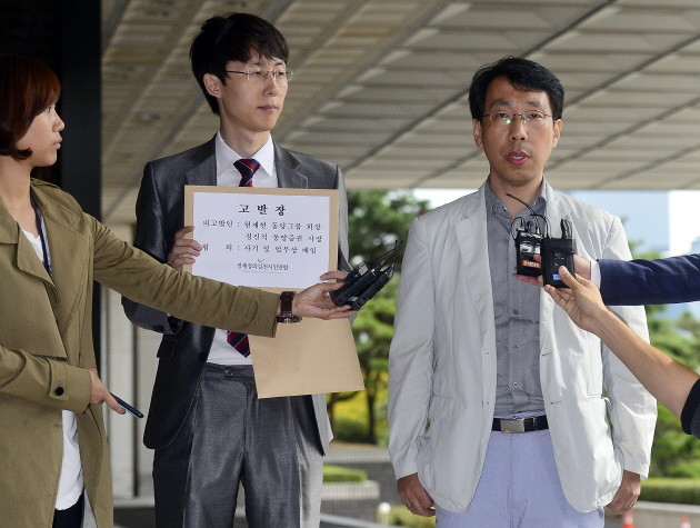 경제정의실천시민연합이 7일 오전 현재현 동양그룹 회장과 정진석 동양증권 사장을 사기 및 업무상 배임 혐의로 고발하기 위해 서울 서초구 중앙지검 민원실로 들어서며 취재진 질문에 답변하고 있다.