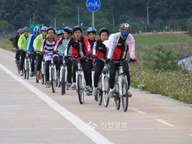 [시민일보]충남 아산시체육교과연구회는 지난 7일 체육교과 연구회 소속 교사 4명과 학생 30명이 금강하구둑에서 대청댐까지 종주하는 '두 바퀴로 함께 가는 희망 동행' 캠페인을 실시했다. 사진은 자전거 도로를 달리는 참가자들의 모습.