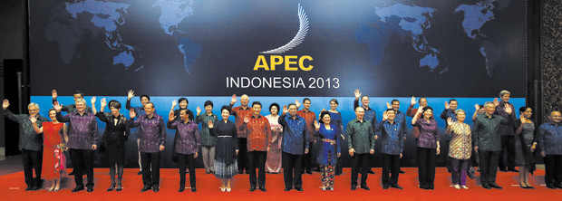 7일 저녁 인도네시아 발리 누사두아 컨벤션센터에서 열린 APEC 정상회의 전통의상 기념촬영에서 박근혜 대통령 등 참석자들이 기념촬영을 하고 있다. 앞줄 왼쪽부터 세바스티안 피네라 칠레 대통령 내외, 스티븐 하퍼 캐나다 총리, 토니 애벗 호주총리 내외, 하사날 볼키아 브루나이 국왕, 시진핑 중국 주석 내외, 수실로 밤방 유도요노 인도네시아 대통령 내외, 푸틴 러시아 대통령, 쯔엉떤상 베트남 주석, 잉락 친나왓 태국 총리, 리셴룽 싱가포르 총리 내외. 피터 오닐 파푸아뉴기니 총리 내외. 뒷줄 왼쪽부터 렁춘잉 홍콩 행정장관 내외, 아베 신조 일본 총리 내외, 박근혜 대통령, 라집 라작 말레이시아 총리 내외, 페냐 엔리케 니에토 멕시코 대통령 내외, 존 키 뉴질랜드 총리, 오얀타 우말라 페루 대통령, 베니그로 노이노이 아키노 필리핀 대통령, 마잉주 대만 총통 내외, 존 케리 미국 국방장관.