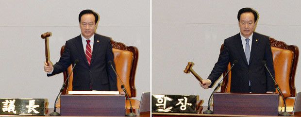 지난 8일 오전 제320회 정기국회 본회의가 열린 서울 여의도 국회 본회의장 의장석의 명패(오른쪽)가 한글날을 맞아 한글로 바뀌어 있다. 왼쪽은 7일 의장석의 명패.