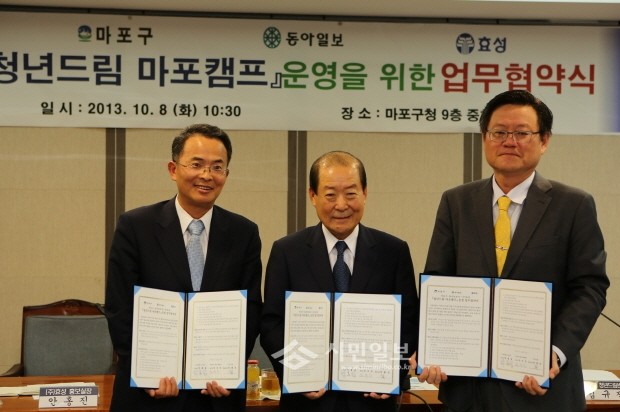 [시민일보]마포구는 지난 8일 구청에서 '청년드림 마포캠프' 운영을 위한 업무협약식을 했다. 사진은 협약식에 참여한 박홍섭 마포구청장, 임규진 동아일보 청년드림센터장, 안홍진 효성 홍보실장 모습.