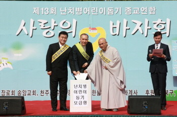 | ▲ 제13회 바자회에서 모은 수익금을 각 종교대표들이 모금함에 모금하고 있다. | ||