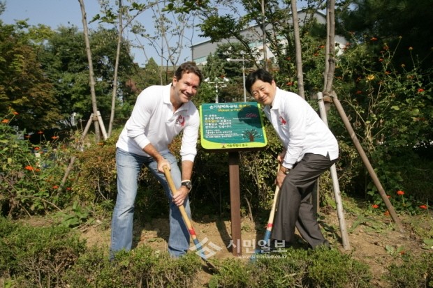 [시민일보]서울 중구는 10일 손기정체육공원에서 다국적 제약기업인 한국릴리와 지속적인 공원 봉사활동에 대한 공원돌보미 협약을 체결했다. 사진은 최창식 중구청장과 폴 헨리 휴버스 한국릴리대표의 협약식 모습.