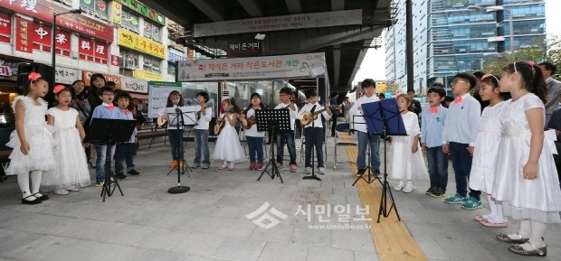 지난 8일 금천구는 독산역 2번 출구 앞에서 '독산역 주변 경관가꾸기 사업 준공식' 및 '작은도서관 개관식'을 개최했다. 사진은 이날 행사에서 아이들이 축하공연을 하고있는 모습.