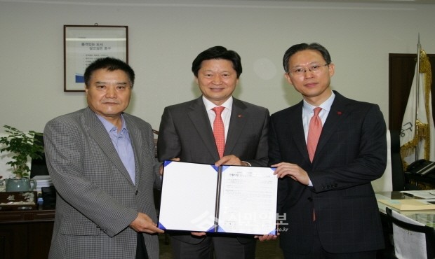 서울 중구는 지난 11일 신세계백화점 본점과 남대문시장 상인회가 '전통시장 상생 발전 협력을 위한 협약'을 체결했다고 밝혔다. 사진은 조창현 신세계백화점 본점장, 최창현 중구청장과 김재용 남대문시장상인회장의 협약식 모습.