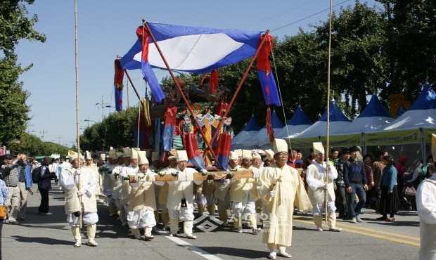 서울 강동구는 지난 12일 오전 제18회 강동선사문화축제가 열리는 서울 암사동유적에서 복있는 사람이 사망했을때 하는 전통놀이인 ‘바위절 마을 호상놀이’를 실시했다. 사진은‘바위절 마을 호상놀이’의 쌍상여 행렬 모습.