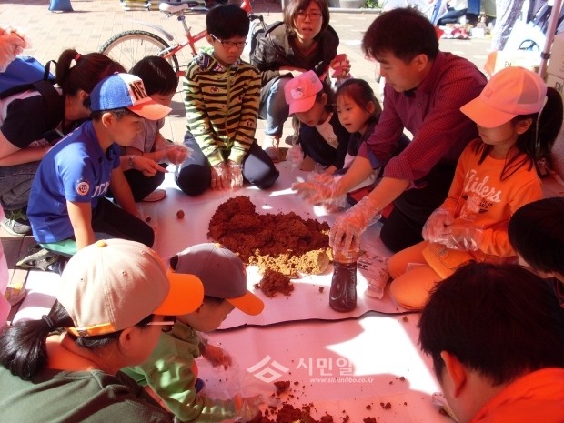 지난 12일 인천 부평구 굴포천과 시냇물공원 등지에서 다양한 환경 체험 프로그램으로 구성된 ‘환경은 생각쟁이’ 축제가 열렸다. 사진은 'EM 흙공 만들어 굴포천에 던지기' 프로그램에 참가한 아이들이 흙공 만들기 설명을 듣고 있는 모습.