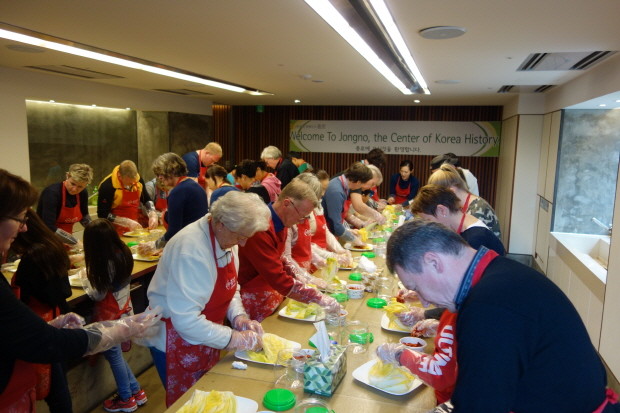 | ▲ 지난 3월 열린 전통문화체험에서 해외입양동포와 가족들이 김치월드에서 김치 담그기 체험을 하고 있다. | ||