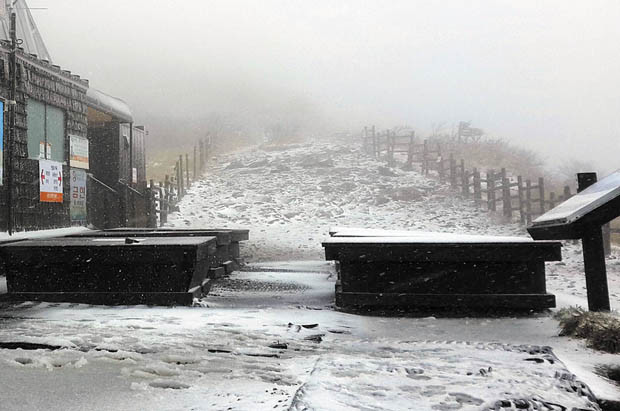 15일 오후 강원 속초시 설악산국립공원 중청대피소에 올 가을들어 첫 눈이 내리고 있다. 설악산국립공원관리사무소는 오후 1시 현재 영하 0.3도의 기온 속에 1㎝ 정도의 적설량을 보이고 있다고 밝혔다. 설악산의 첫 눈은 지난해보다 보름 일찍 나타났다. /사진=설악산국립공원관리사무소 제공