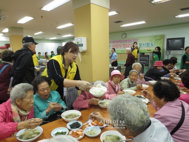 지난 15일 서울 강동구자원봉사연합회와 지역내 사립어린이집 원장들이 함께 '제207회 강동한마음봉사의날' 행사를 열어 저소득층 노인들에게 무료로 점심식사를 제공했다. 사진은 배식봉사중인 자원봉사자와 식사를 제공받은 노인들의 모습.
