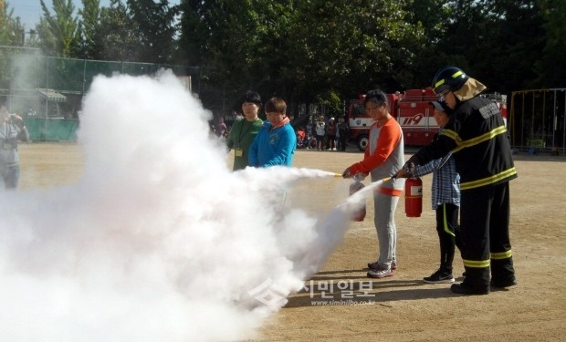 인천공단소방서 도림119안전센터에서 16일 선학초등학교 학생 및 교직원을 대상으로 공공기관 합동 소방훈련을 실시했다. 사진은 학교 운동장서 실제 소화기로 사용법을 배우고 있는 아이들의 모습.