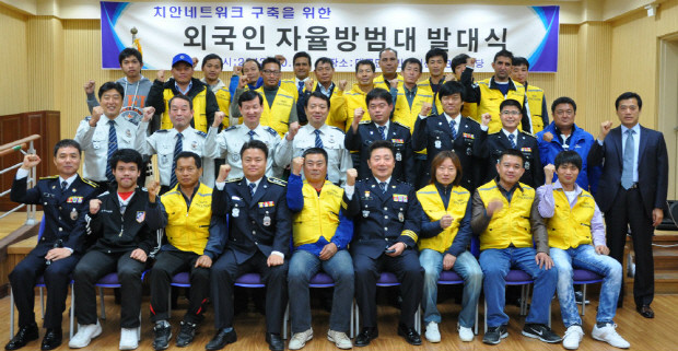 경기 김포경찰서(서장 고창경)는 지난 15일 대곶면주민지원센터 강당에서 4대악 근절 및 외국인 범죄 예방을 위한 외국인 자율방범대 발대식을 개최했다. 사진은 외국인 자율방범대 발대식에 참석한 관계자들이 행사를 마친 후 파이팅을 외치며 기념촬영을 하고 있는 모습.