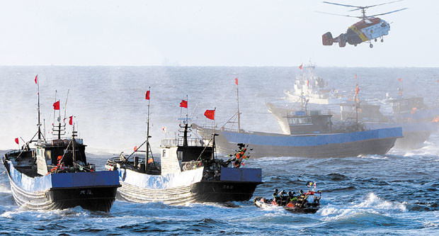 10월 성어기를 맞아 해양경찰청이 불법조업어선 특별단속에 나선 가운데 지난 16일 오후 전남 가거도 북서방 28해리(EEZ 내측 27해리)해역에서 목포해경이 불법조업 중인 중국어선 6척을 나포했다. 특수기동대가 탑승한 고속단정과 서해해경청 항공대 소속 카모프 헬기가 도주하는 중국어선을 뒤쫓고 있다.