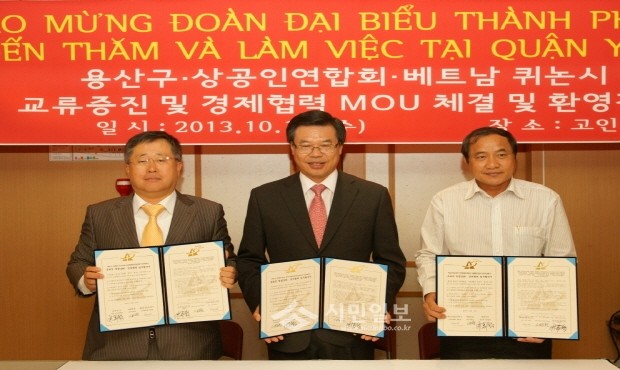 [시민일보]서울 용산구가 지난 16일 베트남 퀴논시와 국제적 역량강화·경제분야 협력 증진을 위한 양해각서(MOU)를 체결했다. 사진은 승만호 용산구 상공인연합회 회장, 성장현 용산구청장과 판 카오탕 퀴논시 당위원회 전담비서 모습.