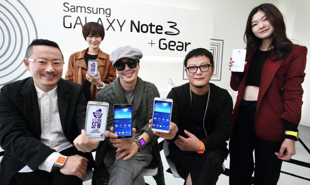 사진은 VIP 라운지에서 패션디자이너 이석태, 최범석, 최철용과 이번 패션쇼에 참가할 모델들이 함께 포즈를 취하는 모습. (사진=삼성전자 제공)