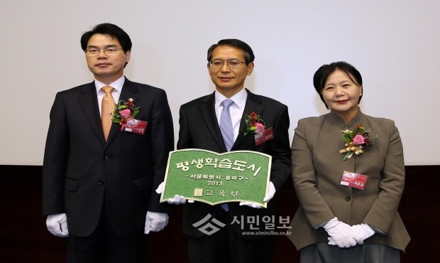 [시민일보]지난 17일 충북 제천시 한방엑스포 공원서 열린 '제2회 대한민국 평생학습 박람회'에서 서울 송파구가 평생학습도시로 선정됐다. 사진은 나승일 교육부차관(왼쪽)과 김찬곤 송파구 부구청장(가운데), 최운실 국가평생교육진흥원장이 기념촬영을 하고 있는 모습.
