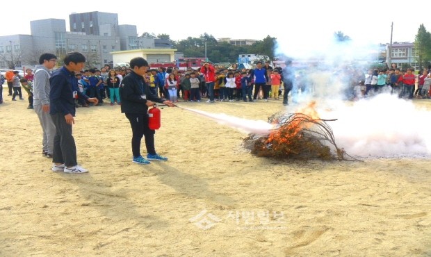 [시민일보]전남 보성소방서 보성119안전센터는 지난 17일 보성초등학교에서 합동 소방훈련을 실시했다. 사진은 학교 운동장에서 소화기로 화제진압 체험을 하고 있는 학생들의 모습.